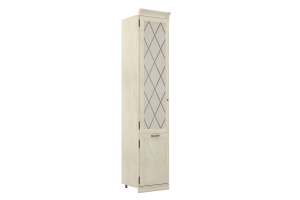 скандинавского интерьера, обстановки в стиле кантри или прованс. Стеклянные фасады, изящные фахверки, карнизы и колонны отсылают к европейскому классицизму и самобытной немецкой архитектуре. Мебель выполнена из экологичной древесной плиты. Рамочные фасады украшены стильными латунными ручками, отделанными под античную бронзу. Меблировка отличается вместительностью: два высоких шкафа с застекленным верхом, ТВ-тумба и настенные полки позволяют хранить под рукой все необходимые вещи. Бесшумную эксплуатацию обеспечивает система скрытых направляющих со встроенным демпфером и петли с доводчиками. Импортная фурнитура гарантирует надежность крепления.