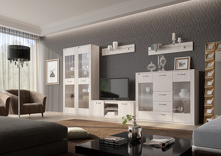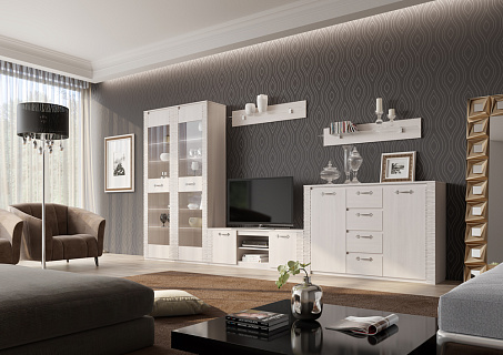 Подойдут длинные комплекты: больше секций и полок, проще распределить вещи по категориям. Это удобно для семейной гостиной, где в комнате живут не только декор и телевизор, но и повседневные вещи.