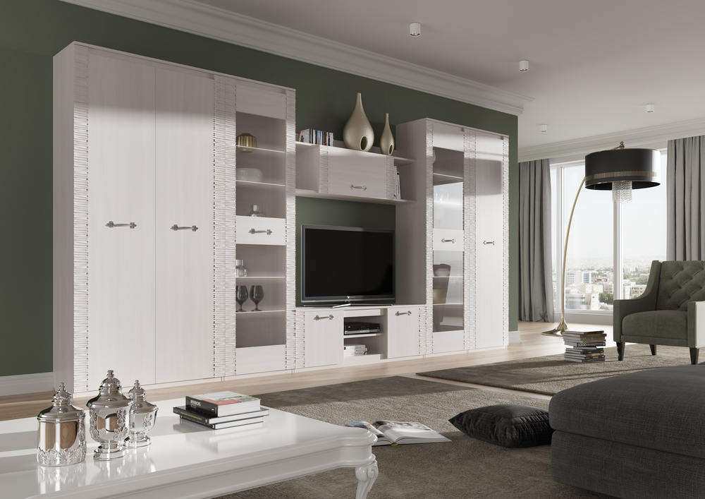 Классическая модель с декоративными элементами и глянцевыми фасадами. Вместительные шкафы и витрины позволяют эффективно организовать пространство и добавить в дом атмосферу элегантности.