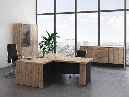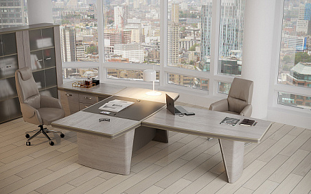 Доступны линейные, Г-образные и П-образные конфигурации. Для небольших кабинетов — компактные наборы с узкими стеллажами и угловыми столами. В просторных помещениях — комплекты с зонами для переговоров и отдыха.