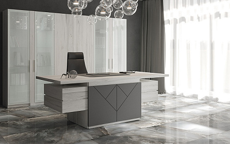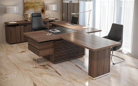 Все элементы сочетаются по цвету, материалам и дизайну. Используем натуральное дерево, шпон, матовые и глянцевые панели. Комплекты дополняются аксессуарами: настольными лотками, держателями для документов, стильными часами.