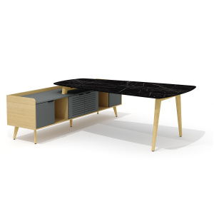 - Столешницы столов и брифинг-приставки выполнены из МДФ с покрытием из HPL-пластика с текстурой черного или белого мрамора. Торцевые части столешниц обработаны по технологии обратного фрезерования с эмалевым покрытием.