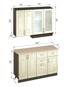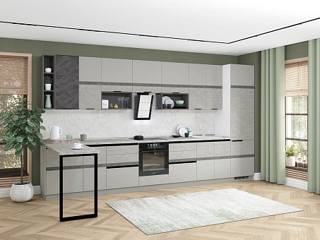 Сочетание простых форм и функциональности. Объёмное тиснение и рельефные рисунки на фасадах подчеркивают современный стиль гарнитура, его оригинальный вид. Набор включает шкафы, столы и бутылочницу, обеспечивая достаточно пространства для хранения кухонных принадлежностей.