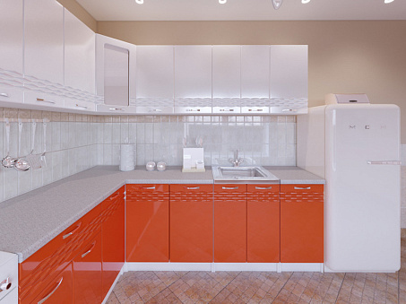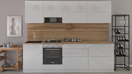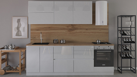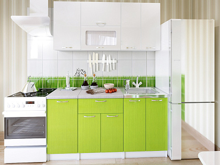 Компактный кухонный гарнитур из качественных материалов. Фасады выполнены из МДФ во влагостойкой ПВХ-плёнке. Корпус из ЛДСП обеспечивает долговечность и устойчивость материала к износу. Кухню можно использовать без ручек — предусмотрены внутренние крепления для установки магнитных толкателей.