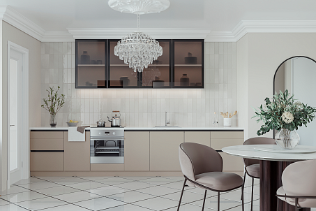Кухня в ванильных оттенках с изысканным декором. Нежный рисунок с 3D-эффектом на фасадах придаёт лёгкости и воздушности. Рисунки патиной привносят в интерьер дополнительный шарм. Сочетание светлого корпуса и фасадов зрительно увеличивает пространство.
