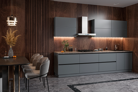 Современная кухня «Бронкс» привлекает внимание стильными фасадами в цвете «Доломит» и фрезерованными ручками «HAND-LESS». Шариковые направляющие обеспечивают легкое выдвижение ящиков. Поверхность фасадов устойчива к разным загрязнениям и за ней легко ухаживать. Собирается кухня из модулей по размерам комнаты.