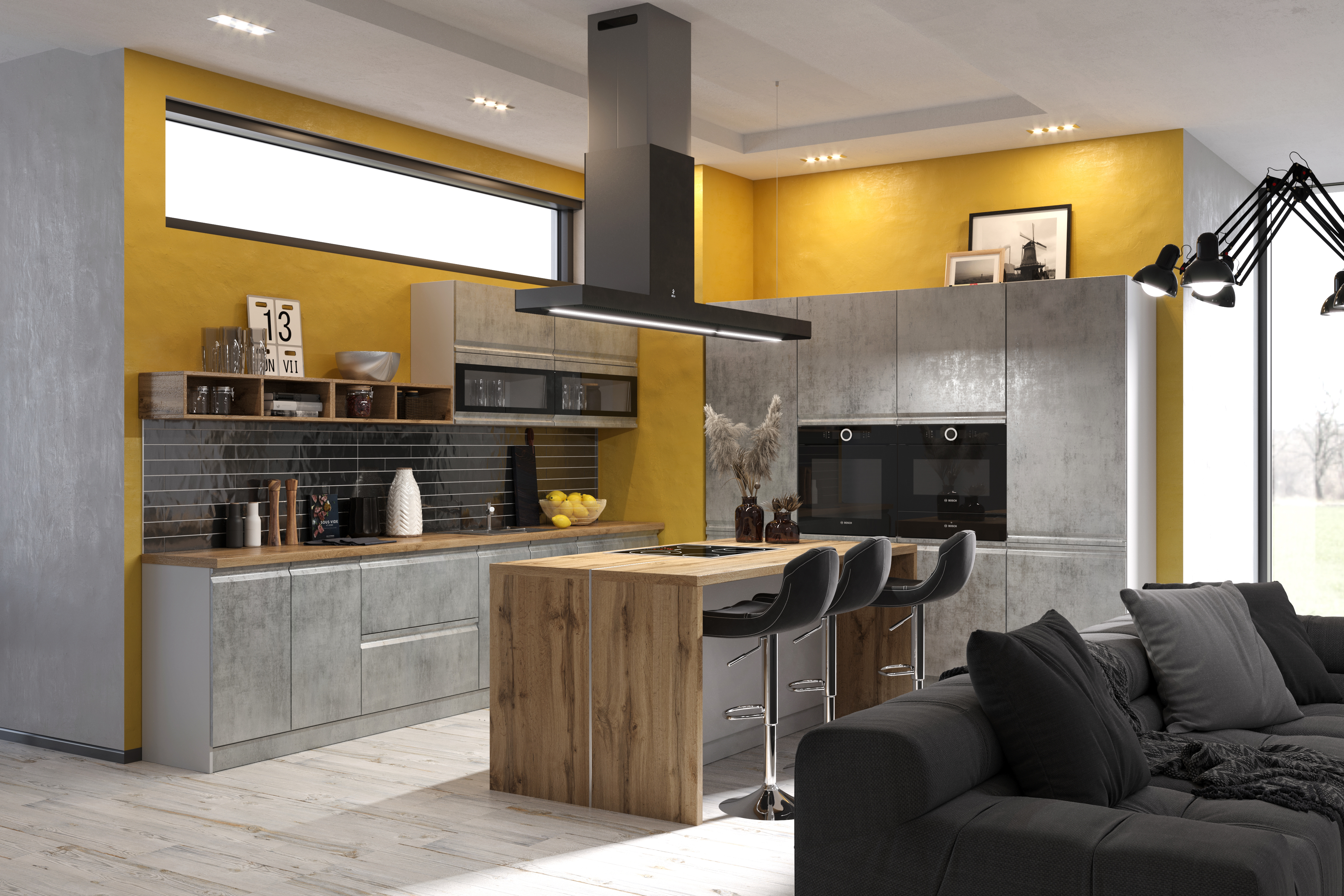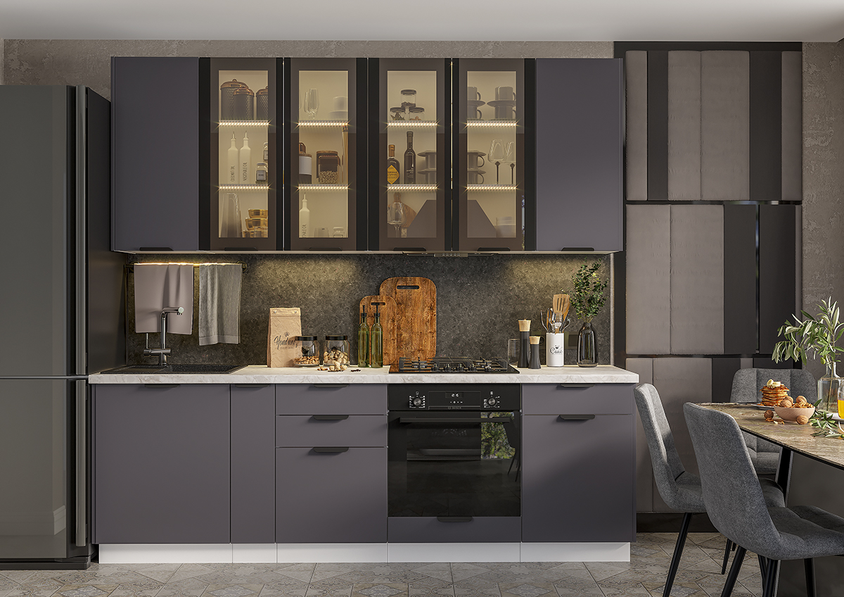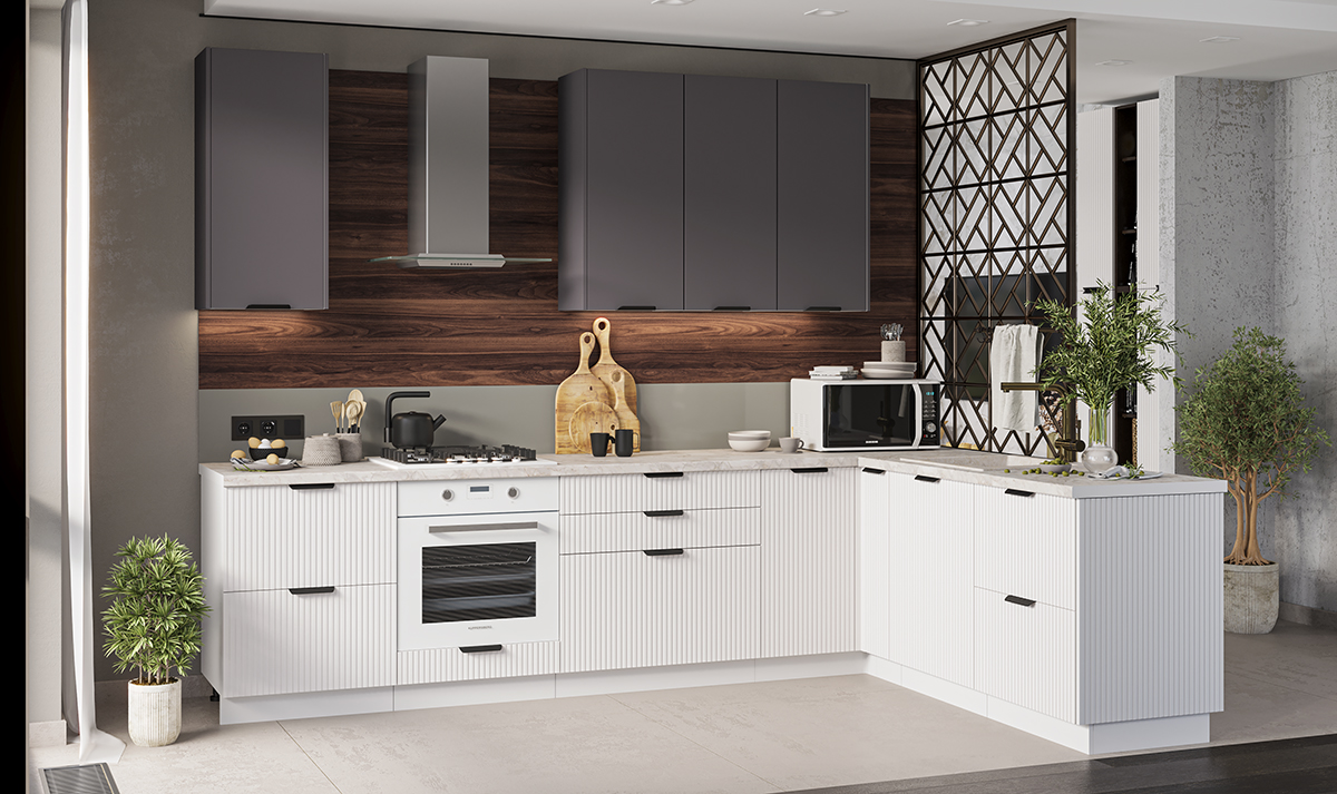 Сочетание простых форм и функциональности. Объёмное тиснение и рельефные рисунки на фасадах подчеркивают современный стиль гарнитура, его оригинальный вид. Набор включает шкафы, столы и бутылочницу, обеспечивая достаточно пространства для хранения кухонных принадлежностей.