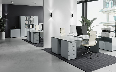 - В ассортименте есть рабочие столы, приставные и мобильные тумбы, шкафы, стеллажи и перегородки для зонирования пространства.
