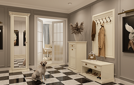 Роскошная модель в неоклассическом стиле, отличающаяся изысканными деталями и высококачественными материалами. Фасады с фрезеровкой и декоративными элементами придают прихожей утончённый вид, а функциональные модули обеспечивают достаточное пространство для хранения одежды и аксессуаров.