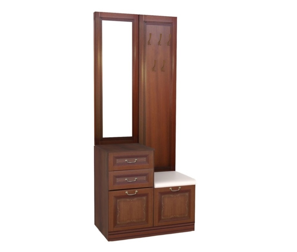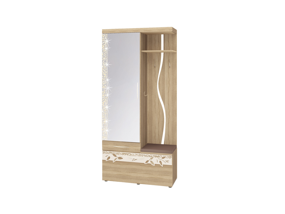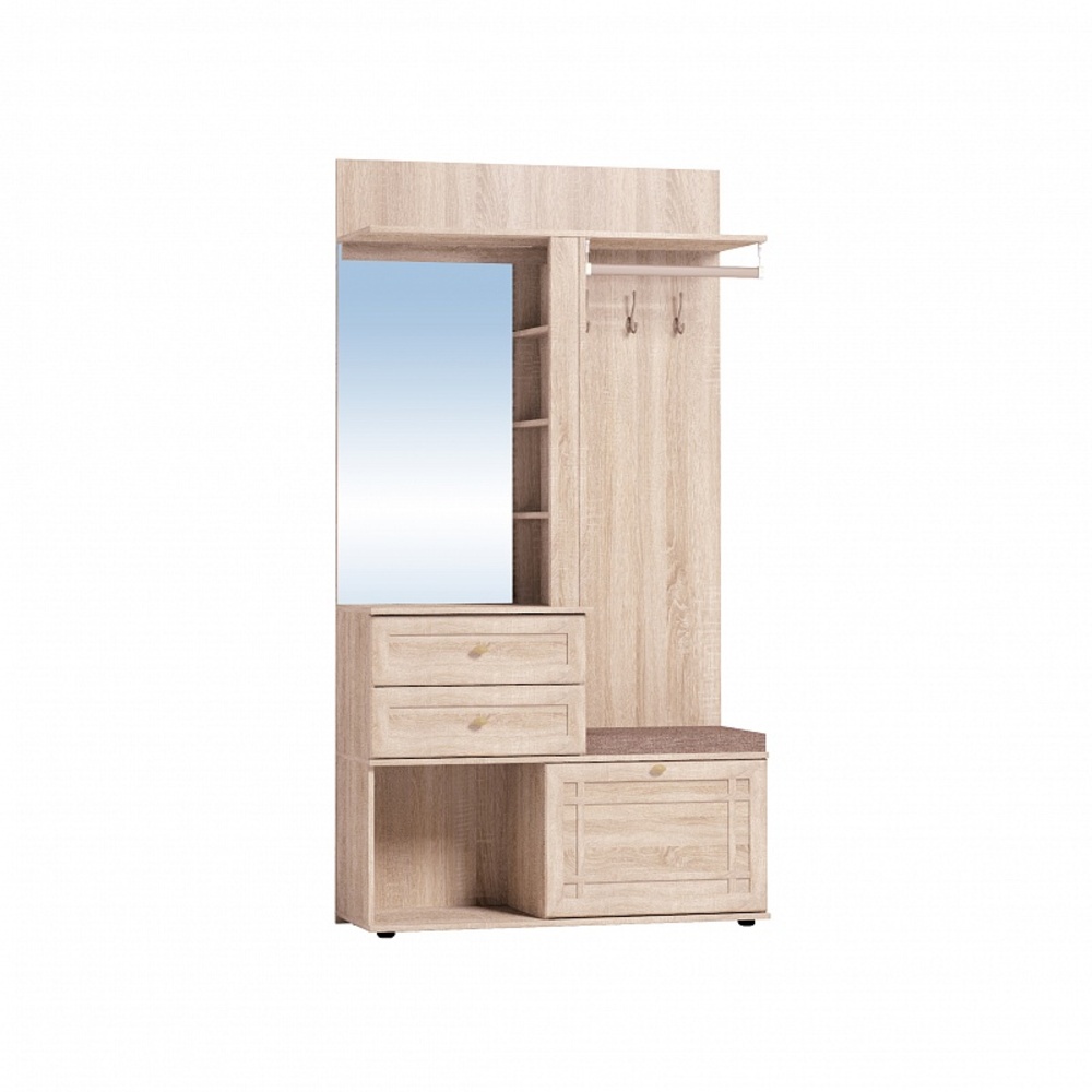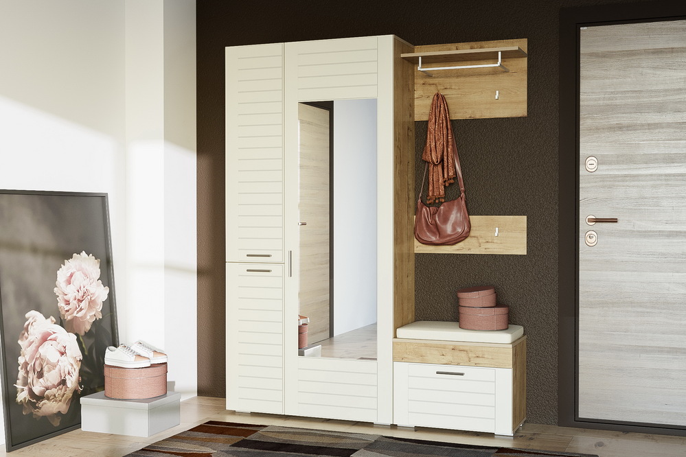 Модель оснащена вместительными шкафами и тумбами для обуви, а также зеркальными поверхностями, которые визуально расширяют пространство. Прочные материалы и надежная фурнитура обеспечивают долговечность и комфорт.