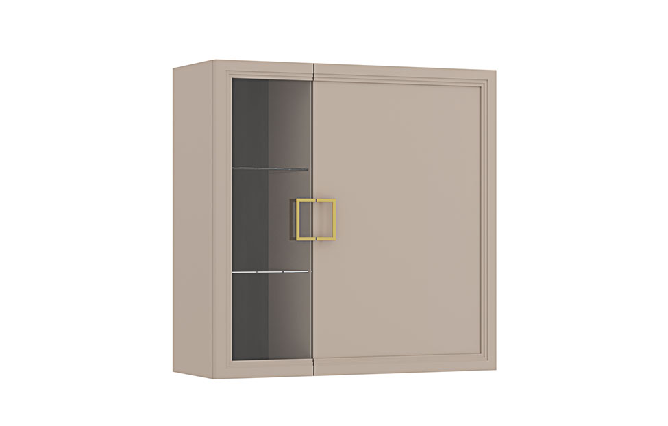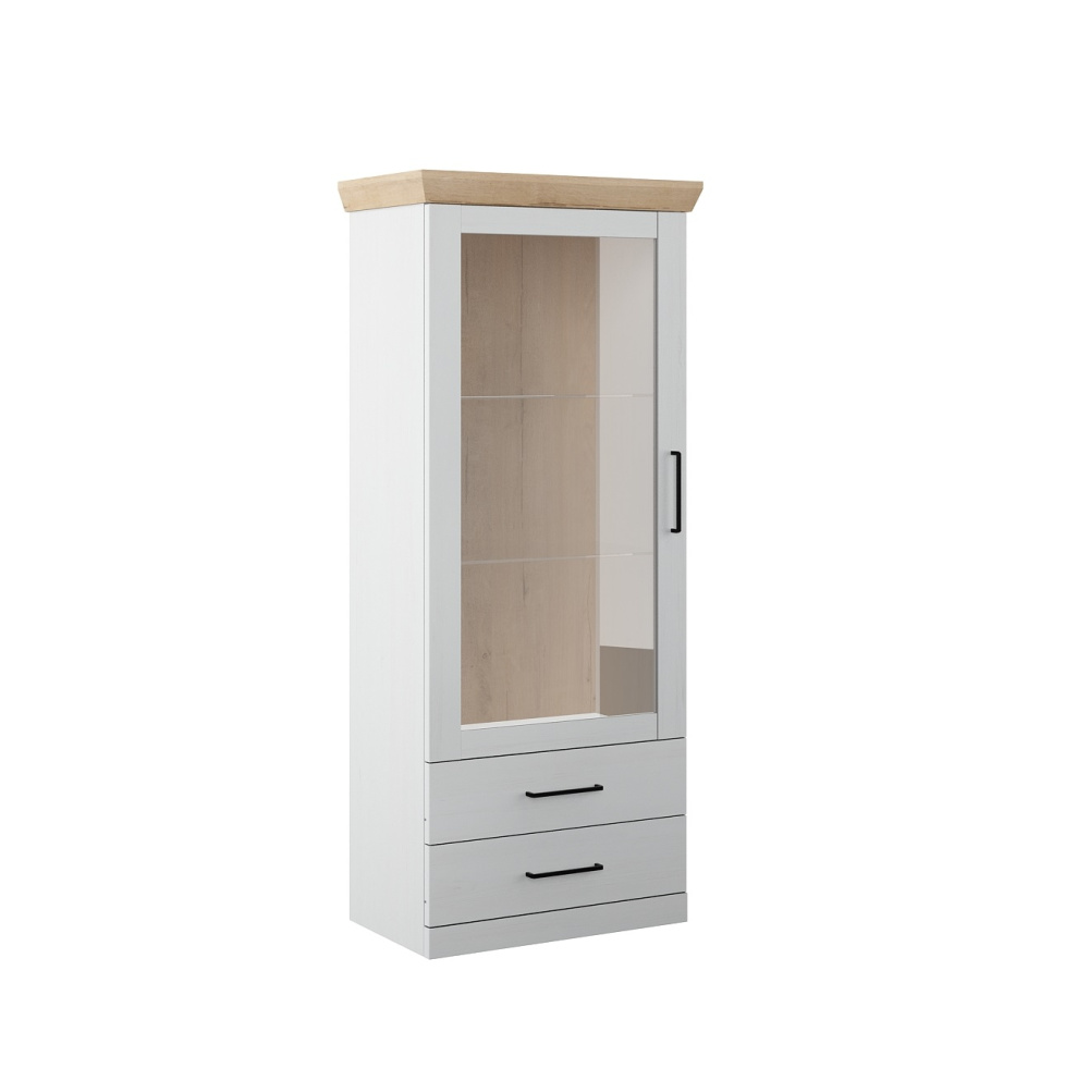 Вверху отделение с двумя стеклополками, с распашной рамочной дверью (вставка двери — стекло прозрачное 4 мм), внизу — два выдвижных ящика на направляющих скрытого монтажа со встроенным доводчиком;