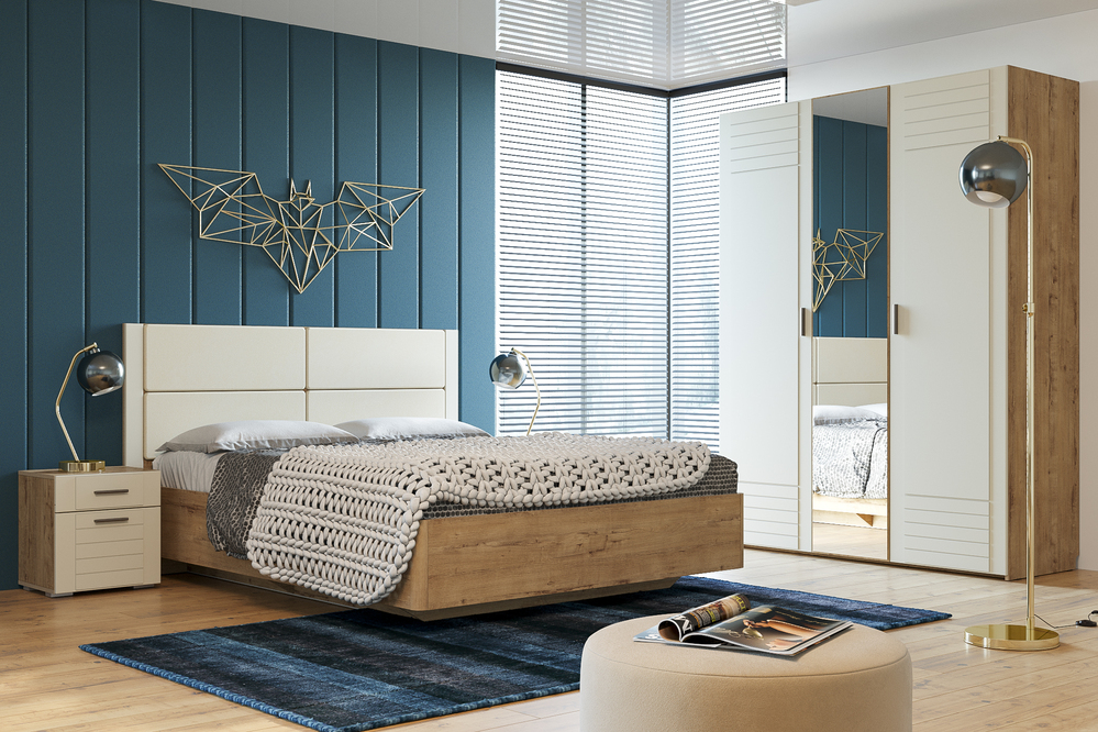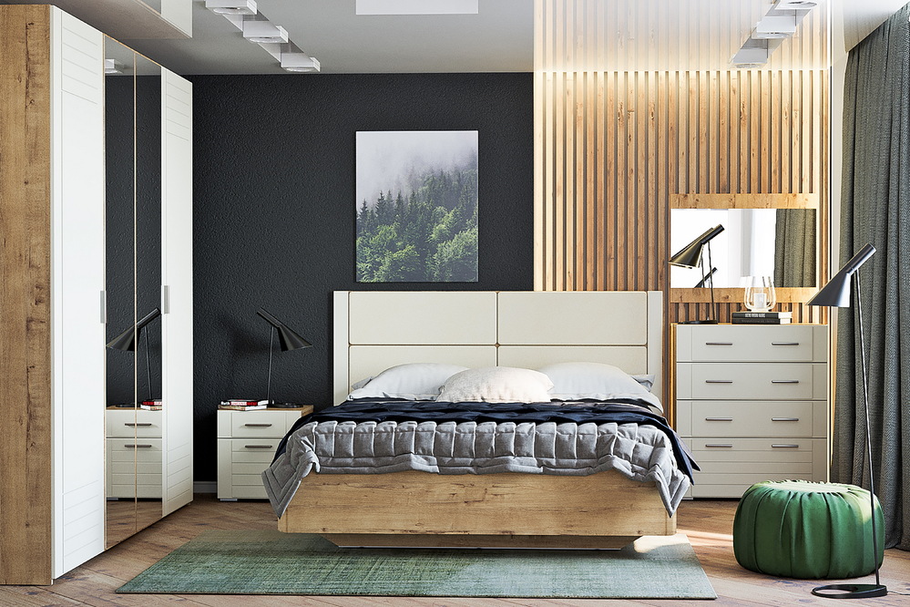 Элегантный комплект мебели, сочетающий графитовые фасады с благородной древесной текстурой. Кровать имеет подъемный механизм, а также вместительный короб для хранения одеял, подушек и других необходимых вещей. Фасад вместительного шкафа украшен эффектной фрезеровкой с объемным 3D-рисунком.