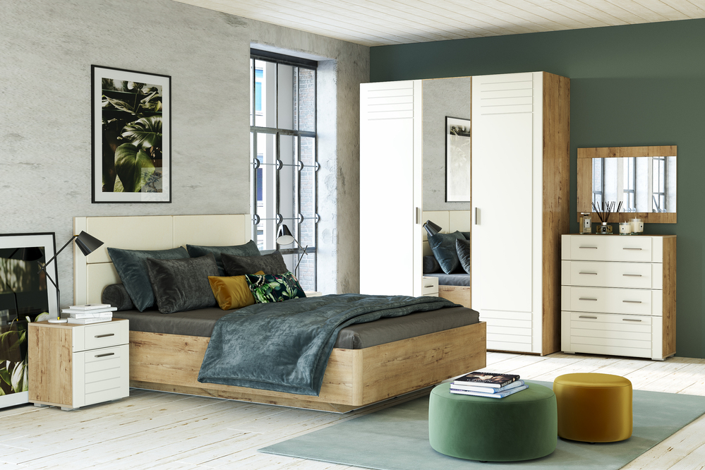 Комплект мебели, выполненный в эко-стиле. Центральный элемент гарнитура — кровать с мягким стеганным изголовьем. В комплект также входят шкаф-купе и вместительная прикроватная тумба. Корпуса и фасады мебели сделаны из качественных ЛДСП и МДФ. Натуральный цвет древесины в сочетании с серым оттенком придают спальне контраста и глубины.
