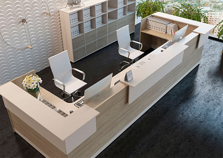 На сайте представлены прямые и угловые модули со столешницами, а также декоративные накладные панели. Вы сможете собрать индивидуальную стойку администратора на свой лад. Все модули имеют оптимальную глубину столешниц, на которые удобно разместить оргтехнику, телефон, документы и канцелярские принадлежности. Офисные предметы будут скрыты от глаз посетителей благодаря высоким декоративным панелям. Они не только придают мебели эффектный вид, но и обеспечивают посетителям комфортную работу с документами.